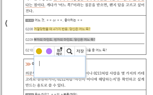 뷰어의 기능은 몇 가지 있습니다. '보기설정, 목차로 찾아가는 기능, 책갈피, 형광펜, 메모'기능이 있습니다.